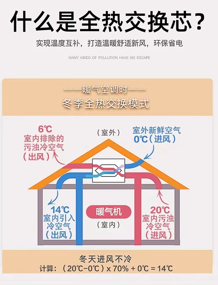 那在冬季的時候呢,還可以利用室內(nèi)暖氣的能量,對室外的冷空氣進行預(yù)熱,再送回室內(nèi),這樣室內(nèi)的暖氣的能量損失減少,并且可以給進入室內(nèi)的新風(fēng)加濕,因此無論是夏季還是冬季進入室內(nèi)的新風(fēng)都可以通過全熱交換芯體,從排出去的空氣中回收能量,從而降低能耗,節(jié)約能源,達(dá)到健康舒適環(huán)保的目的,另外全熱交換效率越高,交換時損失的能量也就越少,也會更加的節(jié)能。
